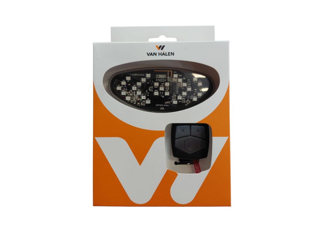 Luz de giro inalambrica con controlador, recargable con USB. Posee luz roja y direccionales: izquierda y derecha.