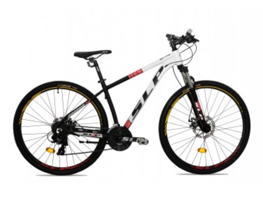 Bicicleta marca SLP modelo 200PRO R29 24V D H – color BLANCO/ROJO/NEGRO T:L – cuadro de ALUMINIO – EQUIPAMIENTO: FULL SHIMANO 24V – HORQUILLA CON BLOQUEO.